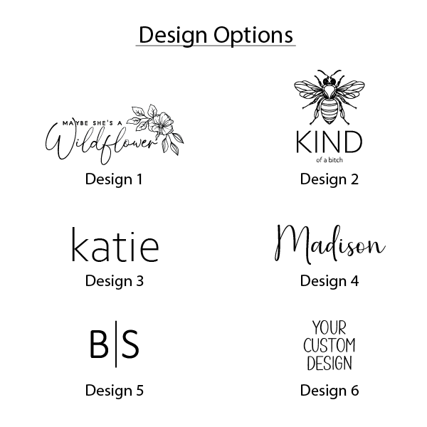 Custom Choices – 5 beautiful colors + 5 unique design options to suit every style or there is an option to add your own personalization